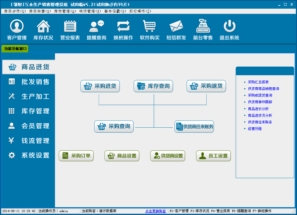 领智软件包含商品进货、批发销售、生产加工、库存管理、会员管理、钱流管理、系统设置几个主要功能模块。